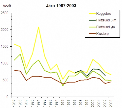 Järn, som det saknas bedömningsgrunder för, utgick ur analysprogrammet år 2003. Halterna är genomgående högre i Sävjaån vid Kuggebro jämfört med stationen i Fyrisån vid Klastorp. År 1991 och 2000 konstateras förhöjda järnhalter vid Kuggebro, vilket i sin tur påverkar halterna vid Fyrisåns mynning vid Flottsund.